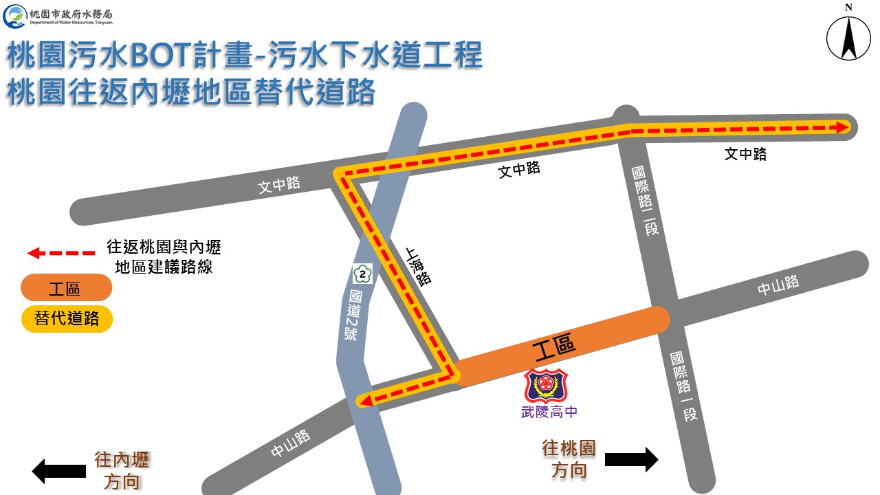 桃園地區污水下水道系統是以促參方式辦理,由「日鼎水務股份有限公司」辦理相關規劃設計及施工作業,為收集縱貫公路桃園內壢間都市計畫區生活污水,目前桃園污水下水道主次幹管線正沿桃園區中山路(上海路口至中山路860號LEXUS車廠)積極施工中,預計完成736m公共管線(目前已完成366m),市府水務局將持續監督民間機構施工進度,以期於112年底施作完成,施工期間如欲通行中山路往返桃園及內壢間的民眾,建議可改走文中路或其他替代道路。