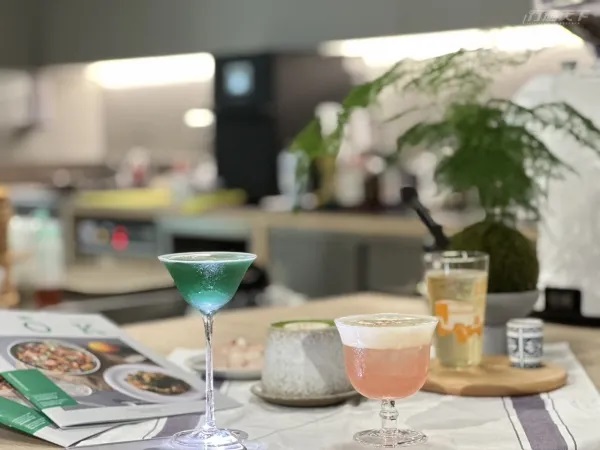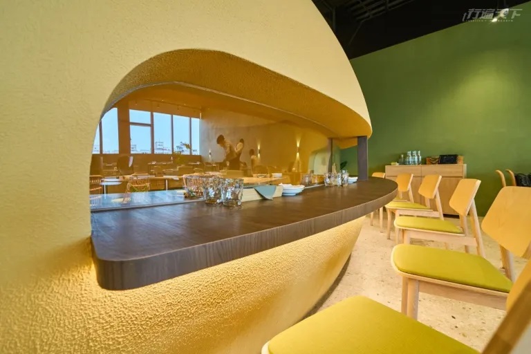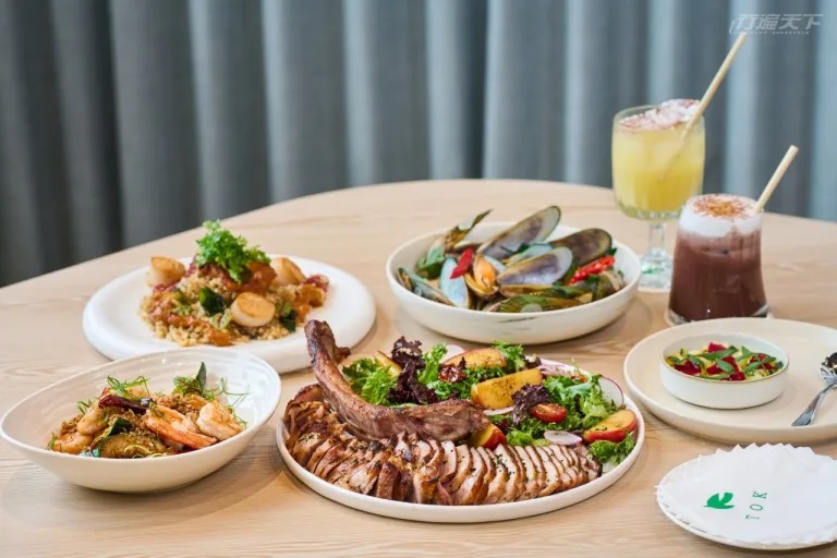 開幕首季菜單主打的「明太子香煎干貝炊飯」,以特調明太子醬、海藻、牛蒡、鴻禧菇與生食級干貝,搭配花蓮富里139號米,口感豐富、滋味濃郁;「嫩煎戰斧豬排佐蜜蘋果」將軟嫩的豬排搭配香煎蘋果、羽衣甘藍、櫻桃蘿蔔、番茄享用,清爽美味;「百里香火炒白酒菜」以肥美紐西蘭淡菜和白酒、辣椒、蒜片、九層塔、百里香快炒,濃縮海味精華。享用美食之際,還可來上一杯台灣品牌的「酉鬼」或日本「伊勢角屋麥酒」精釀啤酒,復活味蕾。除了創新的料理,餐廳的空間設計和氣氛營造也是一絕,靠窗位置可遠眺綠湖生態公園,午後陽光灑落相當舒適;入口處的鳥巢造型包廂,成為最新打卡熱點;大量運用的黃、綠色彩,搭配綠色植栽和鵝卵石地面,烘托出白天自然、夜晚奇幻的用餐氛圍。
