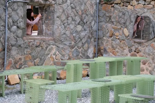 循著階梯往上爬,無止境的階梯可說是東引挑戰的小惡夢,那若是走到一半該有個休憩空間喘口氣、該有多好?藝術團隊草原市務所創造的《粼聚》,以透明的結構體創造休息角落,海綠色的結構象徵環繞島嶼的海水,上方載著島嶼的生活的片段,既近而遠連結鄰里、並與遊子牽繫在一起。材料選用玻璃纖維格柵板,具有耐候與耐酸蝕特性,並自身及具有一定韌性及結構強度,適合臨海場域使用。或出現在階梯的半路、或者在廢墟老屋內休息,都能看到那一大片蔚藍的海,融合著東引人的生命。