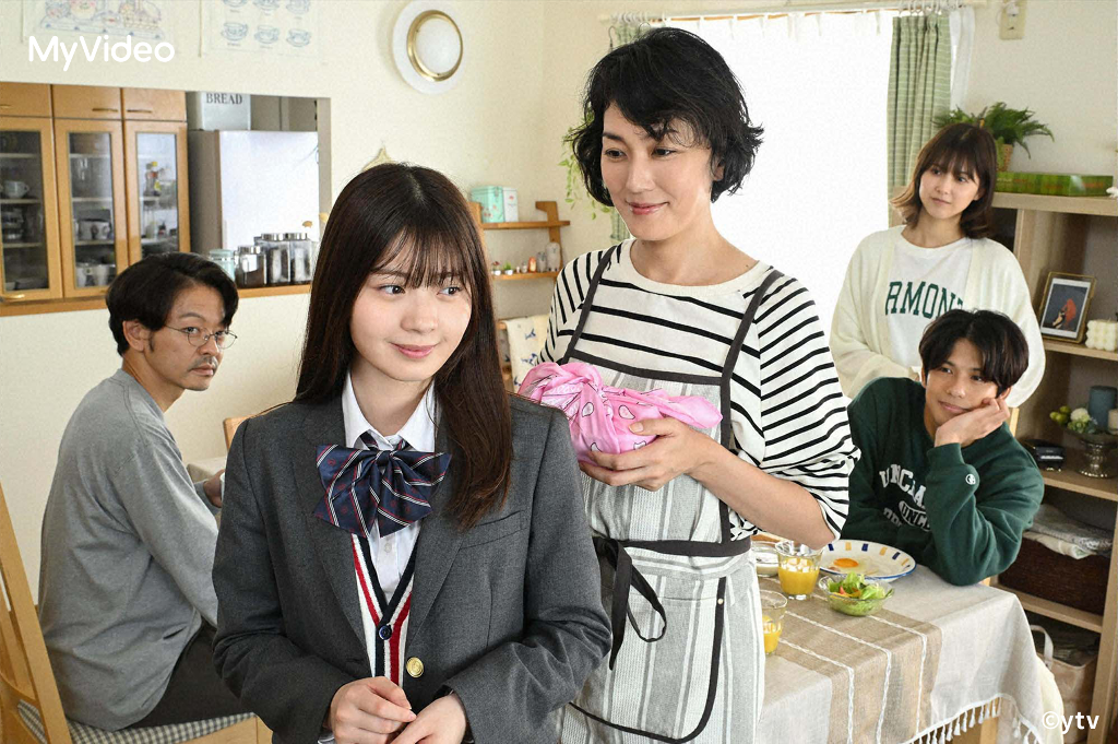 ▲ 星乃夢奈(左二)在劇中是家人疼愛的小女兒,和父親山中崇(右一起)、姊姊渡邊理佐、母親板谷由夏、舅舅森崎溫(左一)一家人感情融洽。(圖:MyVideo)