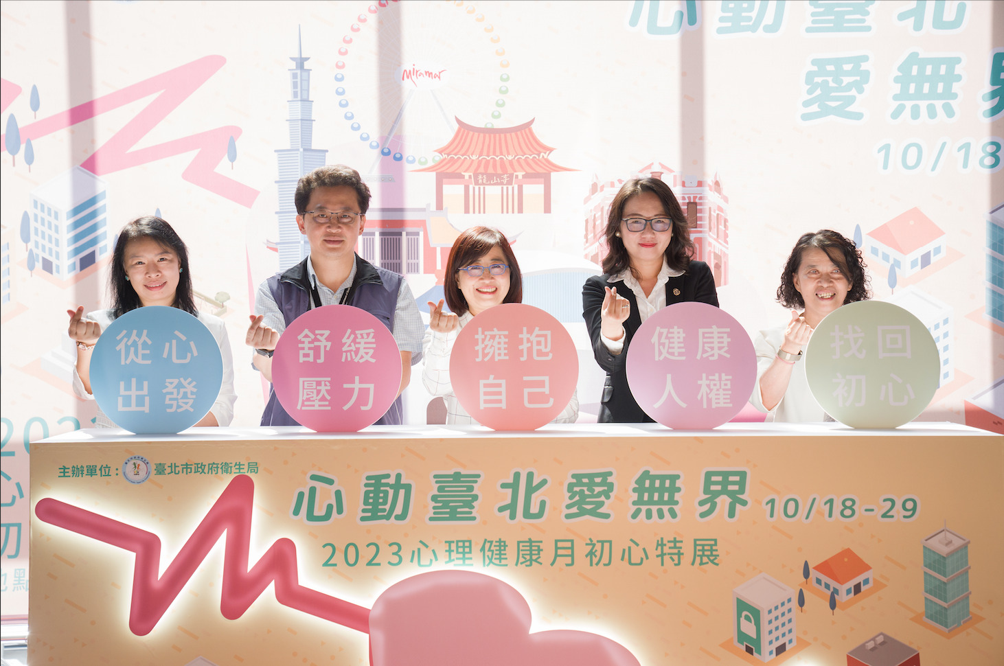 「心動臺北.愛無界」,臺北市政府衛生局表示,為讓民眾更加關注心理健康與覺察自身心理感受,於今(18)日上午11時在剝皮寮歷史街區,舉辦「2023心理健康月初心特展」活動記者會,衛生福利部心理健康司陳亮妤司長特別蒞臨活動現場,也在臺北市副市長林奕華及衛生局長陳彥元陪同下,參觀並體驗多項心理健康主題式展區,本次活動自112年10月18日至10月29日止為期11天的特展,開設職場、愛情、親子等心理健康講座,安排手作紓壓、呼吸放鬆深度體驗及親子繪本說故事等多元體驗及闖關活動,由心理師帶領您Fun輕鬆,歡迎市民朋友一同相揪看展、闖關拿好禮!