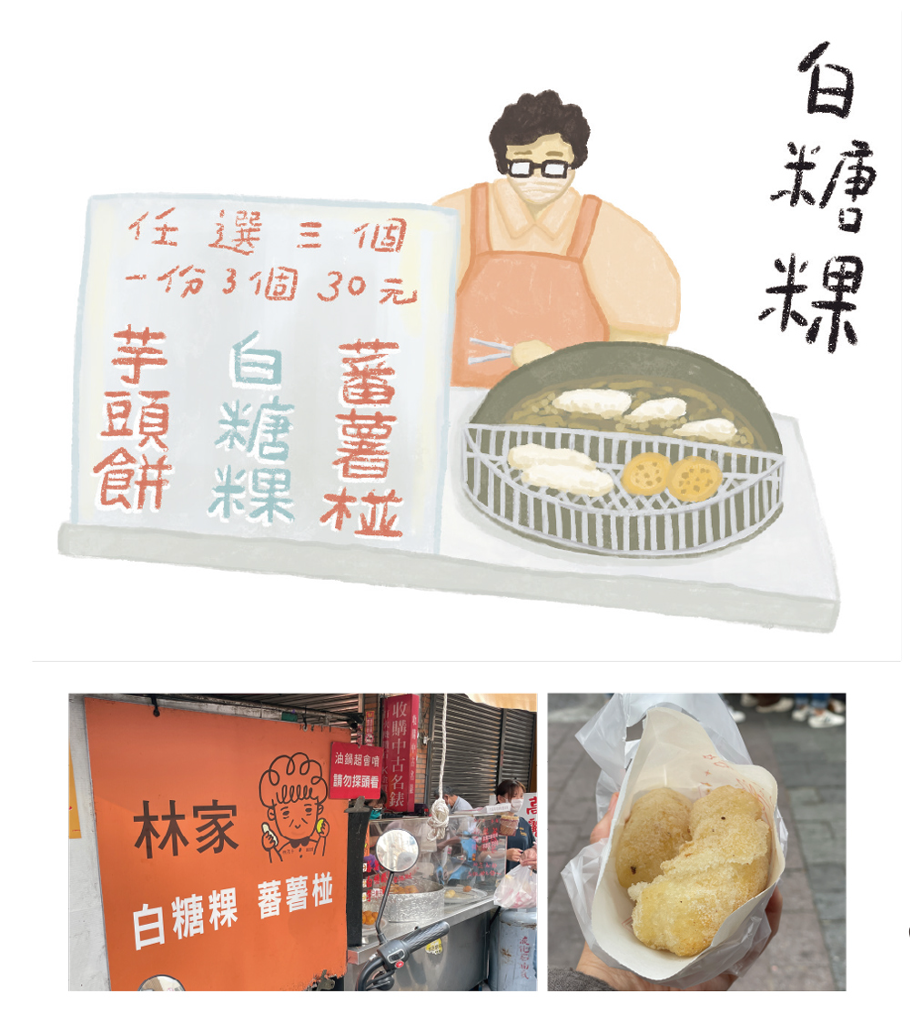 白糖粿是將糯米糰下鍋油炸,起鍋後裹上甜甜的花生糖粉,外酥內Q越嚼越香,散發出淡淡米香,適合趁熱食用。另外也有蕃薯椪與芋頭餅,一份任選三個才30元,超便宜又好吃!
