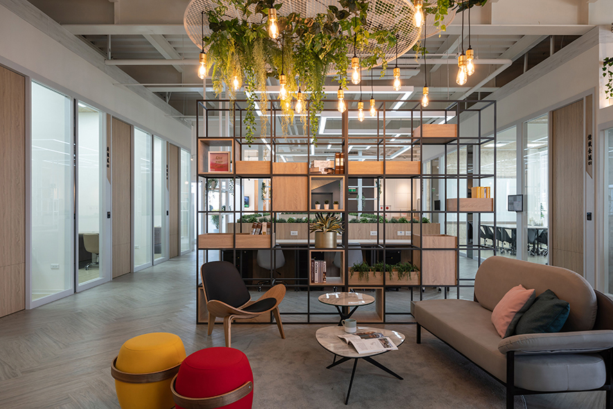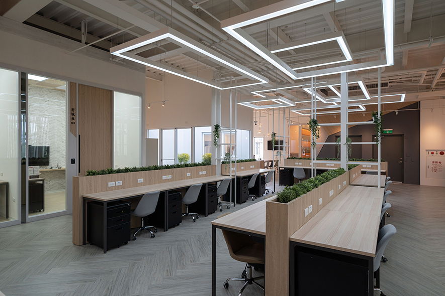 作為一處商辦空間,詠絮團隊分別規劃開放式辦公區和獨立辦公室,供使用者依需求自由運用,並將「舒適」和「高辦公品質」的核心概念以現代設計語彙表現,藉由不作天花板、保留管線的工業風格搭配幾何造型燈具和鐵件,予人專業俐落的感受,同時,地坪、辦公桌及門片選用木紋呈現,平衡冷冽線條與純白帶來的無機感,佐以植栽引入自然綠意,為場域更添溫度,營造每一位辦公者皆能專注投入的愜意氛圍。