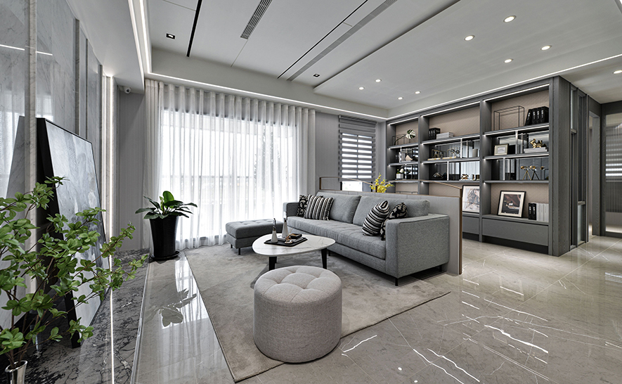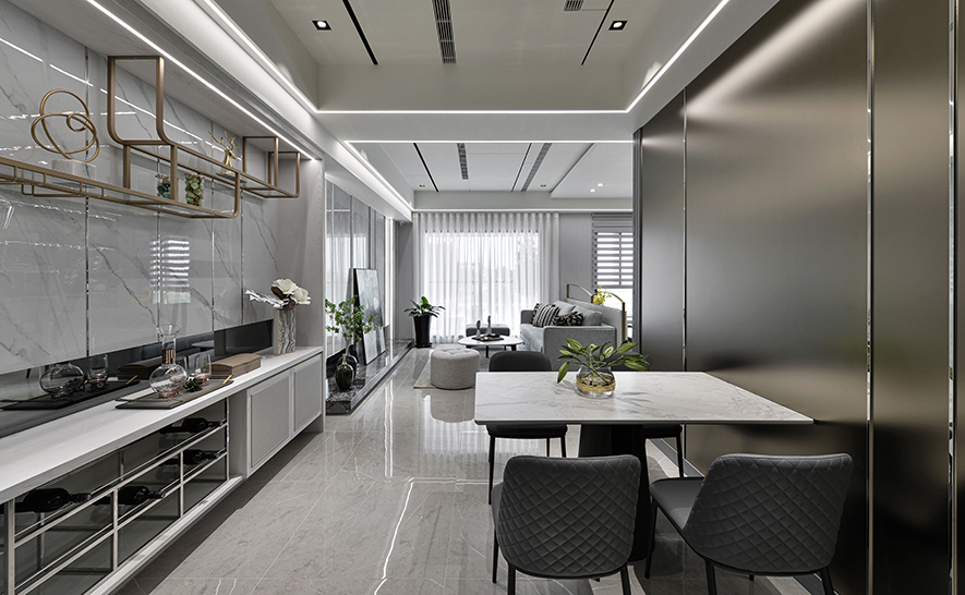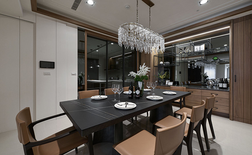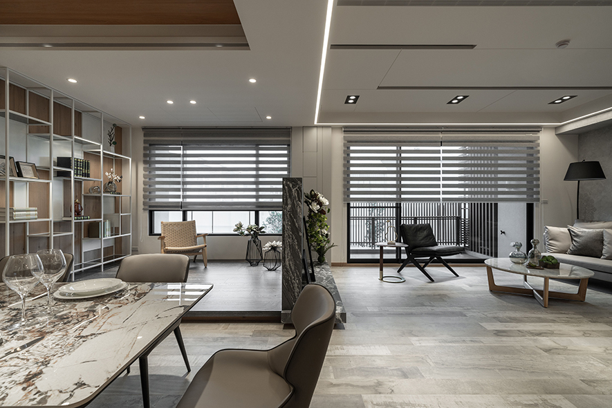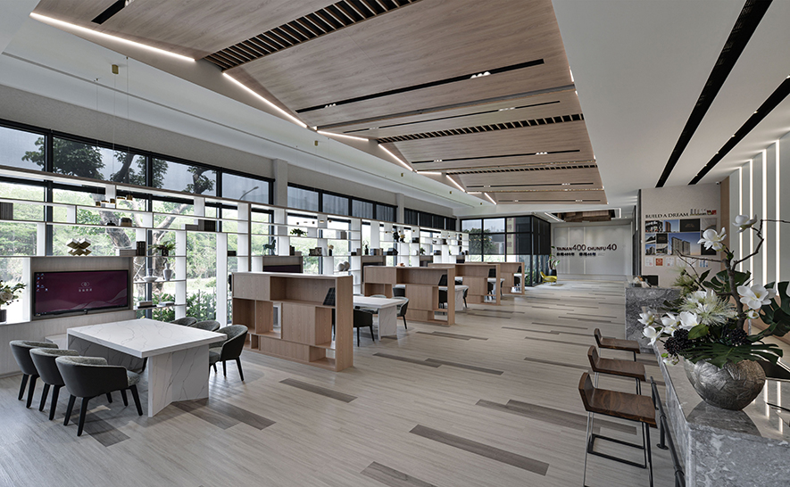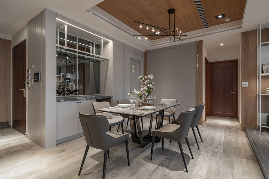 回應建案將「便利生活」與「森、林、木」結合的概念,詠絮團隊運用石材、鐵件、鏡材等各式材質,構築出一座洋溢現代風格的實品屋,並規劃大片對外窗及開放式公領域,拉近與戶外森林的距離,壁面、天花板等處則匯入木質,塑造多層次美景之際,也貼合「親近自然」的定位,充分展現案場優勢。