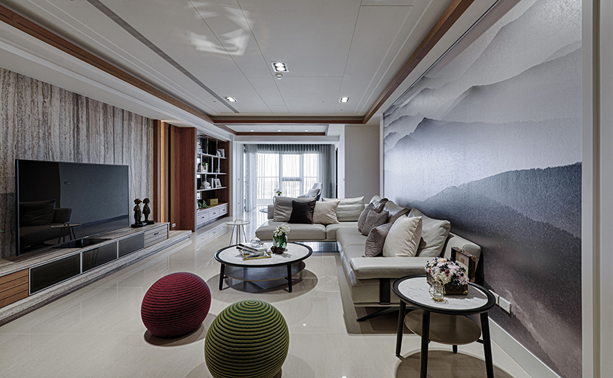 實現業主對寫意度假生活的想望,團隊結合檜木打造簡約北歐風,令場域不僅洋溢柔和暖意,更散發沉穩雅致的香氣,電視牆選用直式木紋理,塑造向上延伸感,對向水墨壁紙搭配兩側線條造型框,彷彿裱出一幅山水畫作,將屋主身為書法藝術家的身分融入其中,展現飄逸灑脫的氣質,另於窗畔預留一方空地,供使用者享受戶外的清幽自然。