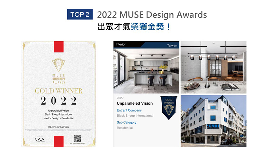 MUSE Design Awards由國際獎項協會International Awards Associates(IAA)主辦,以發掘全球設計繆思為宗旨,為建築、室內、時尚等領域提供全面的發光舞台。喬治黑羊設計 李家齊 設計師 於作品《透・景》中,以穩重的黑色與溫潤的木質共築一室,活化家宅的自在樣貌,於2022賽事奪得「金獎」榮耀,將品牌推向國際舞台!