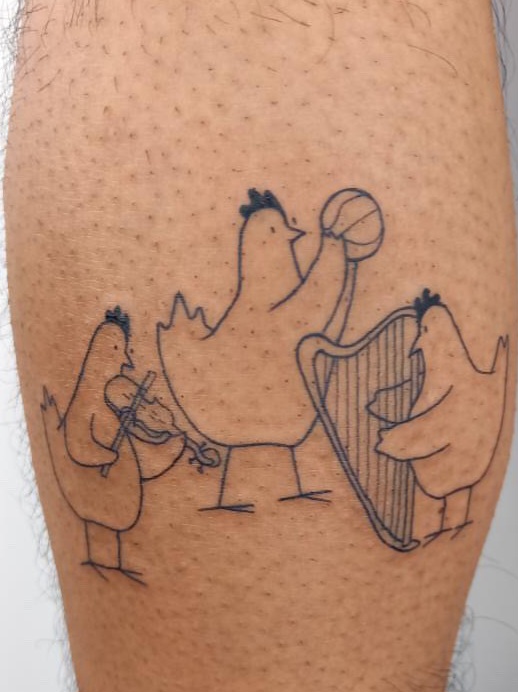 特別一提的是,大家還相約一起組成『柏林三隻小雞』賣萌刺青團,由於圖騰小雞在柏林非常受歡迎,KEVIN更是提前三個月就先預約,KEVIN的刺青落在左小腿,自己在刺青圖裡是中間打籃球的那隻小雞,廖柏雅笑著說:『對我來說小提琴是生活的一部分,但不是全部,所以我選擇了平時很喜歡的籃球,比較可愛,也象徵著做自己喜歡做的事。』