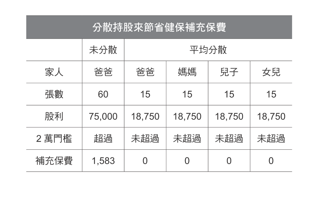 ▲ 如果將股票分散在4 個家人身上,每個人的股利都沒有超過2 萬,就都不用繳交補充保費,可以省下1,583 元,拿來聚餐吃飯也不錯。(圖:時報出版)