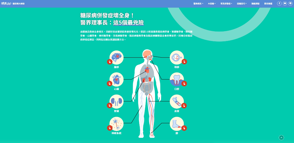 針對糖尿病議題,《健康2.0》所製作的「糖尿病大解密」策展頁,拉出「醫師病友」、「AI抗糖」、「常見併發症」、「控糖技巧」等各方面解析,特別的是「常見併發症」及「控糖技巧」首次邀集了糖尿病學會、腎臟醫學會、眼科醫學會、心臟學會、骨科醫學會、牙周病醫學會、糖尿病衛教學會及糖尿病關懷基金會等單位的理事長或權威專家,深入解析糖尿病併發症原因,揭露心腦血管、腎臟、眼底、足部、口腔等併發症兇險之處,同時提出糖友照護關鍵方法。