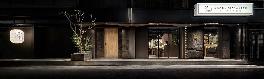 靜矗於櫛比高樓間,一幢披著深色石皮的玄色平屋幾與夜色相融,簷下懸掛的燈籠隨著晚風款款搖曳,流瀉月光般朦朧光暈,引人步趨探尋。輕啟門扉,一陣鍋香竄入鼻尖,旋即映入眼簾的「金月」二字與藍白紙籠發散幽然微光,相伴石、竹交織的半弧端牆和枝葉隱現的高聳碧竹,彷彿落入悠遠的江戶時期,濃厚的日式古韻使每位訪客留下深刻印象。循逕入內,宛若月形般圓弧相接的座椅整齊羅列,人們於其間共享傳統鍋物與新鮮物產,在味蕾與視覺的饗宴中,享受如望月般圓滿的團聚時刻。
