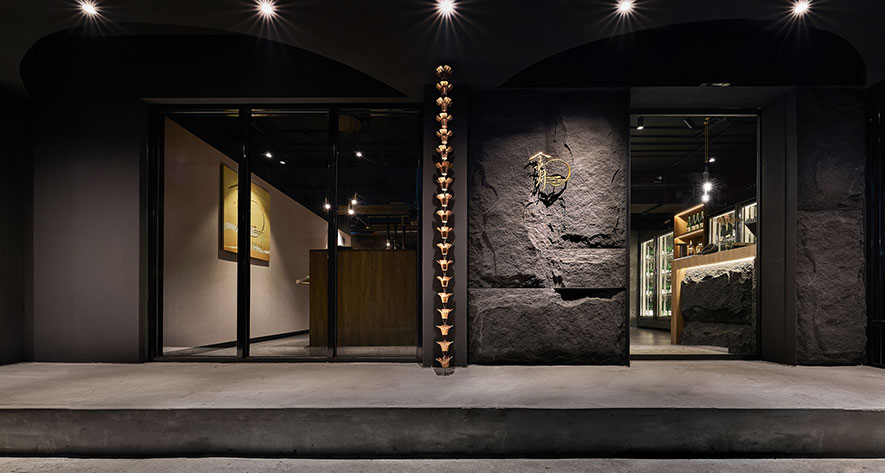 店面外觀以水泥台階、落地玻璃和深色石皮,打造簡約純粹的樸實感受,消弭建物與人們的距離感,另於招牌旁加入傳統日式建築常見的落水鏈,凸顯餐廳風格與料理樣式。