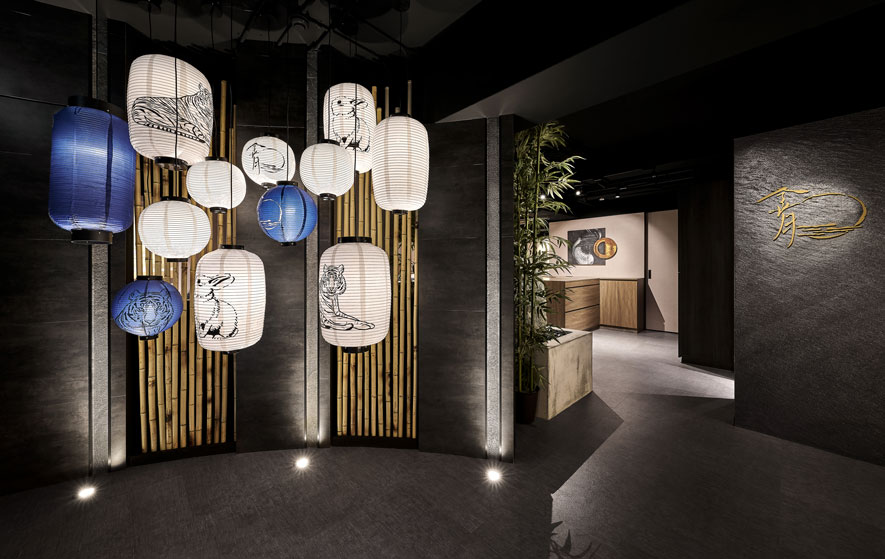 配合店面形象的展現,我們於入口處設計一道主視覺牆,藉由天然的石材與竹子彰顯質樸踏實的日式精神,並懸掛數盞象徵圓滿意象的燈籠,其印有虎、兔圖案,隱訴餐廳於虎年籌備、兔年呈現的品牌故事,而藍白雙色則在日本文化中具有喜氣的含義,運用飽含寓意的吉祥物件、自然建材,打造和風感濃厚的特色門面,令顧客印象深刻。
