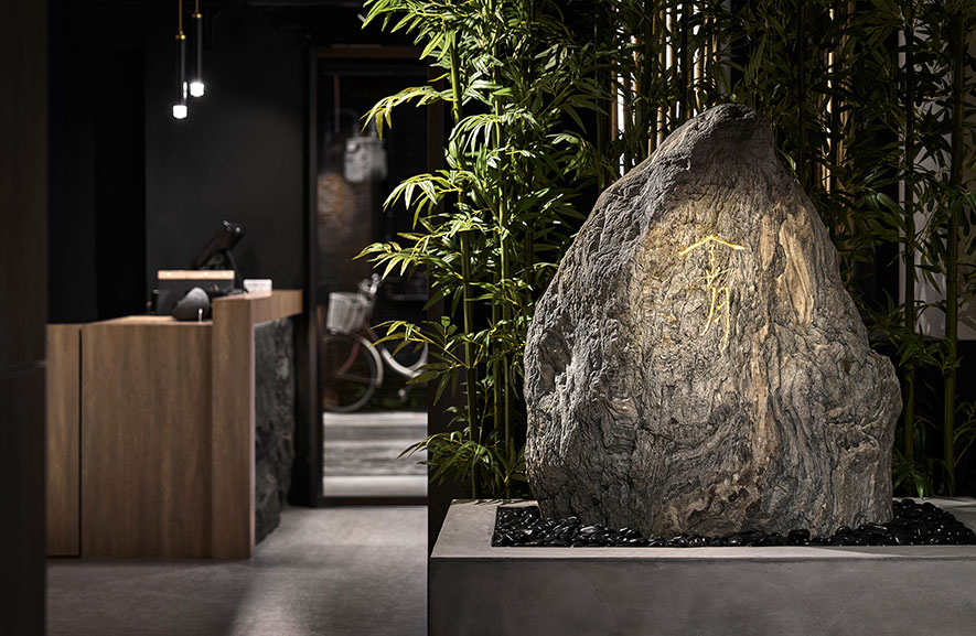 延續整體風格,客席區與飲品吧台間採用原石和碧竹,營造日式庭園的氛圍與禪意,而鋪貼於牆面的鏡材,則為用餐者帶來無限延伸的視感,達至放大場域之效。