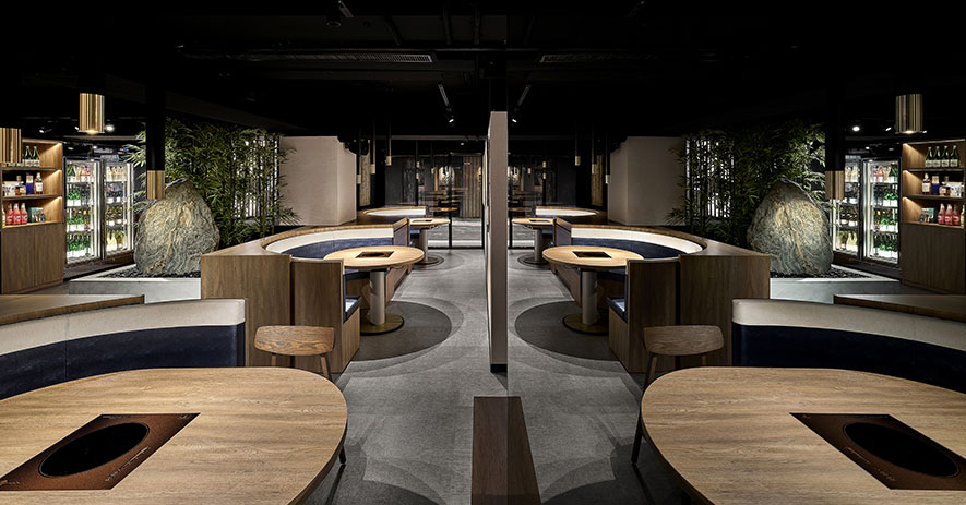 Inspired by the Moon word in the brand Golden Moon, INK DESIGN SPACE's presiding designer Kathy Chien centered her design on the image of a Full Moon. Incorporating the concept of Roundness, we skillfully infuse the theme of a Full Moon throughout the feature wall, the booth-style seating area, and the tableware for hot pot dishes. By integrating the symbolism of completeness and togetherness that the full moon represents, we aim to convey a sense of joy and harmony to every guest. Our design caters to the positioning of a high-end Japanese hot pot restaurant. We artfully exploit modern building materials, such as natural stones, stone veneers, wood veneers, and metals, combined with traditional Japanese bamboo and lanterns to evoke a blend of ancient and modern Japanese Zen aesthetics. Moreover, we actively embed the concept of seeking various forms of balance, performing a design that agreeably complements nature-inspired cuisine. By establishing a dialogue between the ingredients and the space, we create a bridge for interaction between diners and culinary creations, achieving a balanced and harmonious state among the ambiance, the people, and the food.