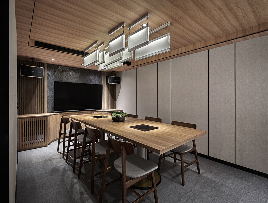 包廂以木質為基調,呈遞溫潤靜謐的用餐氛圍,搭載機能完善的影音設備,提供顧客更多歡度餐敘時光的選擇。