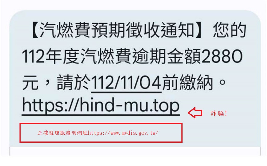 【記者 朱達志/台東 報導】最近有多位民眾反映收到【汽燃費逾期徵收通知】簡訊,連結後畫面疑似監理服務網,要求民眾線上繳納112年汽燃費,臺東監理站查證該簡訊所載網址不是「gov.tw」結尾,不屬於政府機關網址,是造假的一頁式詐騙釣魚網頁。若有收到這類詐騙簡訊,千萬別點選來路不明的網址,避免個人資訊或錢財遭騙取。