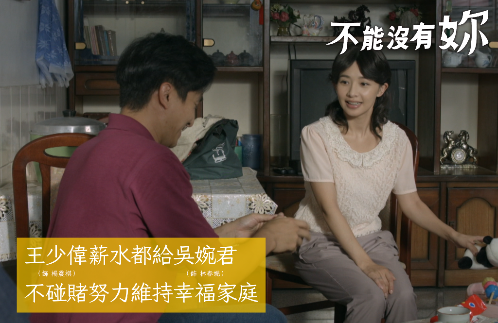 大愛劇《不能沒有妳》王少偉在劇中演活了一個婚前會讓人陷入戀愛腦的男友,婚後卻是一百八十度大轉變的家暴丈夫。跟所有家暴的戲碼一樣,很敢承諾,吳婉君也把被家暴的妻子樣態演得栩栩如生,當王少偉飾演的震祺說不能再讓老婆擔心決定換工作,生活重新來過,吳婉君飾演的春妮每次都買單。