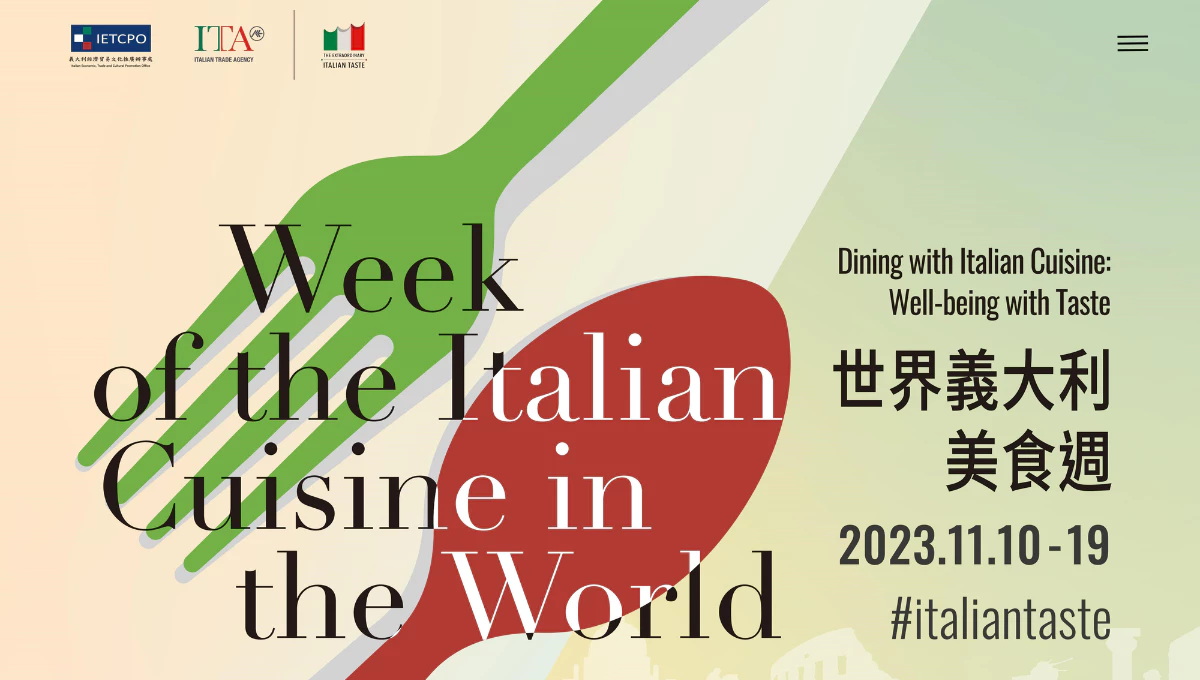 義大利經濟貿易文化推廣辦事處貿易組(Italian Economic, Trade and Cultural Promotion Office in Taipei-Trade Section,以下簡稱 ITA)於本屆「世界義大利美食週」台灣活動中,特 別邀請正宗義大利料理餐飲業者共襄盛舉,包括多家五星酒店義大利餐廳,如義大利米其林星 2 級主廚掌舵的君品酒店「雅意 Artbrosia」、寒舍艾麗酒店「LA FARFALLA 義式餐廳」、台北美福大飯店「GMT 義大利餐廳」、精品酒店慕軒飯店「GUSTOSO 義大利餐廳」、台北文華東方酒店「Bencotto 義大利餐廳」、台北遠東香格里拉大飯店「Marco Polo Restaurant 馬可波 羅餐廳」;來自義大利品牌台灣分店包括威尼斯百年咖啡廳「福里安花神咖啡 Caffè Florian」、 羅馬排隊冰淇淋名店「Old Bridge 義式冰淇淋」;榮獲義大利紅蝦評鑑的「La Mole Taipei」; 獲選為「世界十大純素冰淇淋店」的「Nice Cream 義式手工冰淇淋店」;獲得義大利拿坡里披 薩協會認證的「OGGI 歐奇窯烤披薩」、台北喜來登「Pizza Pub 比薩屋」、「Milano Pizzeria Taipei」、「BANCO」、「Vesuvio Pizzeria 想義廚房」;榮獲 CAPUTO 世界披薩職人經典賽 國際組冠軍「Peppino 培皮諾小館」;獲選「亞太 50 最佳披薩」的「Zoca Pizza 佐佧義式窯 烤披薩屋」與「CURA PIZZA」;榮獲台灣 500 盤評鑑的「Bella Roma Taichung」與「Restaurant Re-」;義大利主廚坐鎮名店「Cantina del Gio」、「Fumo」與「Black Pepper」……超過 50 家義大利餐廳,將以最道地的義大利料理,熱烈邀請所有人們一起回到餐桌、一同分享喜悅。