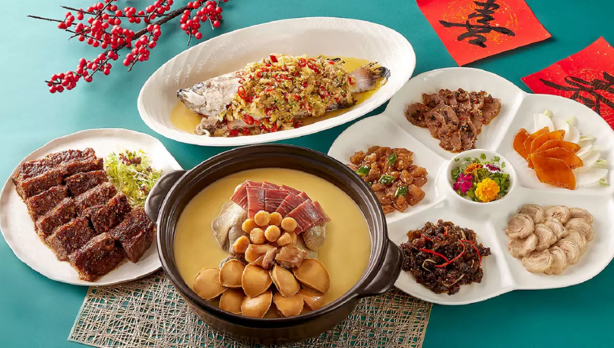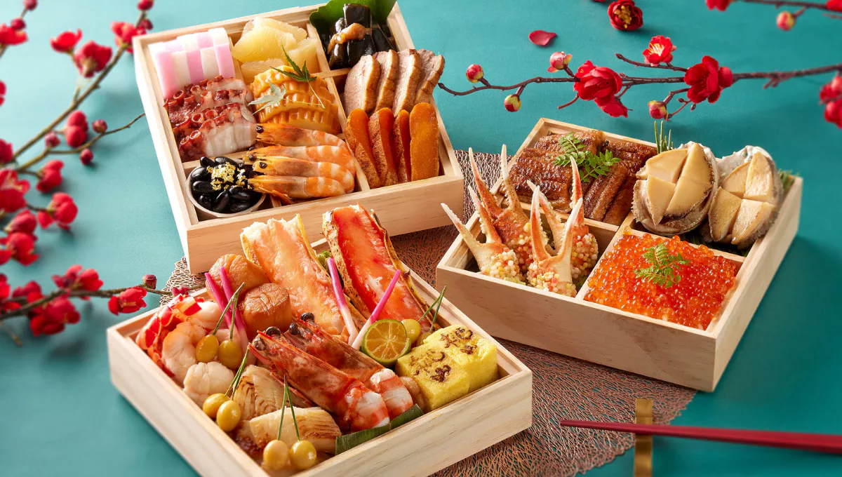 魚、北海道干貝、大蝦等豪華海鮮,團圓海陸雙饗。日本人過年必吃的「御節年菜」,三層木盒盛裝著寓意吉祥且做工繁浩的精美菜餚,龍蝦、帝王蟹腳、鮑魚、烏魚子、鰻魚、鮭魚卵、黑豆、銀杏等 20 餘種山珍海味,期許來年豐收富足。SUKHOTHAI 泰式餐廳推出「鴻運開泰年菜組」包含酸辣拌海鮮、金錢蝦餅、清蒸檸檬龍虎斑、香蘭葉包雞、泰北海陸龍蝦湯等八道式泰味料理,酸辣帶勁開好運。