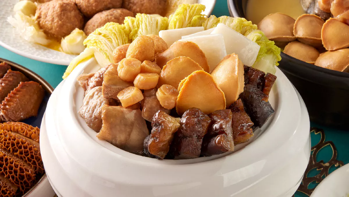 不少政商名流年菜指名的請客樓歷年年菜之王「雲腿濃湯佛跳牆」,選用小土雞、干貝、金華火腿、火爪腿等入甕,注入經八小時熬煮的老母雞湯底,甕中依序堆疊頂級婆參、瑤柱、鮑魚、娃娃菜、花膠等食材,每一口都是真材實料的好味道。米其林指南內推薦必嚐的「鮑魚一品雞」將老母雞、豬大骨以大火滾煮,燉煮期間悉心照料才能熬出奶白湯色,再加入金華火腿、干貝、鮑魚與小土雞續燉,歷時兩天的精華美味、鮮美濃厚的極致湯品。其它年節必備菜色亦有吸飽蟹肉湯汁、花膠滑糯的「花膠蟹粉獅子頭」、層層米香與豆沙交織,加上酸香桔餅與鳳梨果乾的「藜麥紅豆鬆糕」、辰園餐廳招牌「潮式滷水拼盤」以及新品「抹茶御品紅豆年糕」,簡單復熱快速上桌,在家輕鬆還原星級美味。