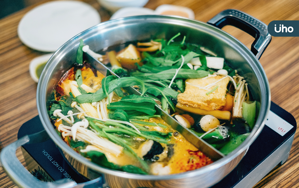 菇菇蔬食湯底:杏鮑菇60公克、芋頭120公克、玉米100公克、紅椒50公克、茼蒿菜100公克、豆腐150公克、薑片10公克,中藥材包括草果2顆、孜然粉1茶匙、乾辣椒2公克、黨蔘4公克、小豆蔻2公克、川芎2公克、紅棗5顆。