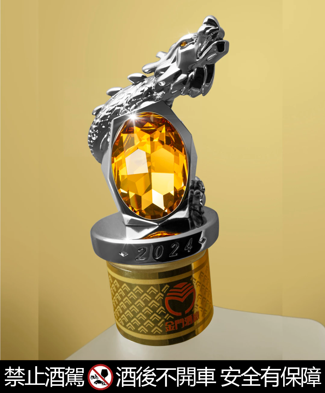 延續兔年水晶生肖酒推出後的熱烈迴響,黑松公司攜手金門酒廠再推「晶彩盛年金門高粱酒-2024龍年版」水晶生肖系列酒,瓶身以「豐收金」為基調,維妙維肖的「龍抬頭」鑲嵌Swarovski元素水晶,燦金的光澤象徵龍年春天甦醒的豐饒收穫,加上龍本身具有的「人中之龍」好寓意,此款水晶生肖系列酒,蘊含著滿滿藝術價值、富饒豐收之祈願,是龍年必收的強運酒款!即日起,全台各通路陸續限量上市。