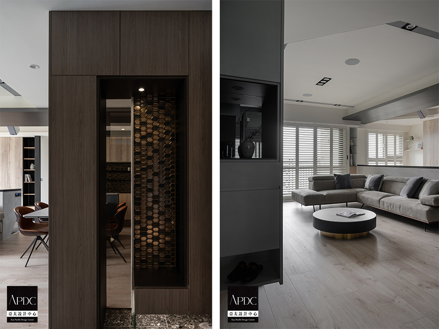 ▲深色的花紋磁磚地,於玄關界定出落塵區,周圍環繞木質、馬賽克等材質的造型櫃體,並增添一座可防潮殺菌的電子衣櫃,方便業主吊掛外出衣物。