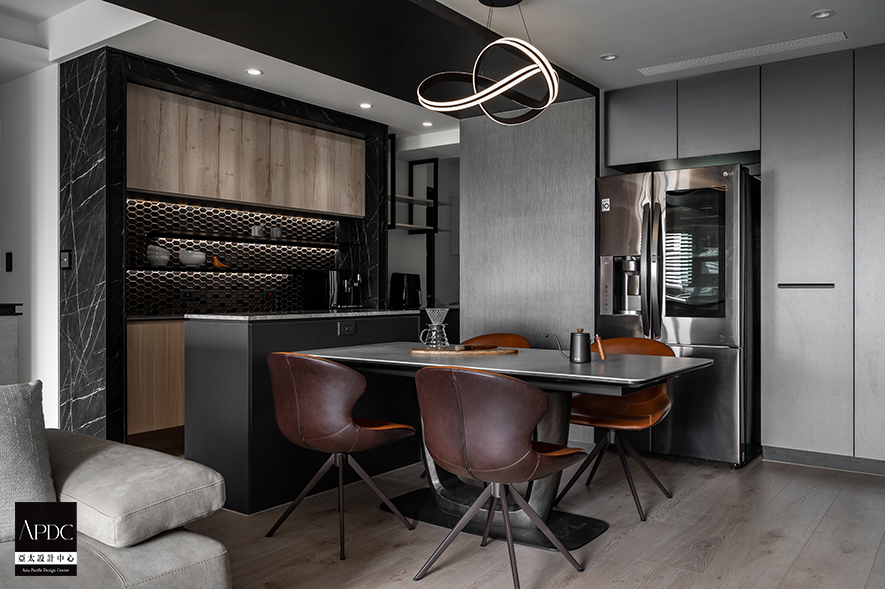 ▲線條優雅的餐廳吊燈下,擺設暖棕皮革椅與簡約的黑白色餐桌,側邊設置一座中島,作為料理、備餐緩衝區,餐櫥櫃則由木質、黑色石紋外框與仿金屬馬賽克組成,配上燈光映照鐵件層板,呈現異材質結合的時尚美感。