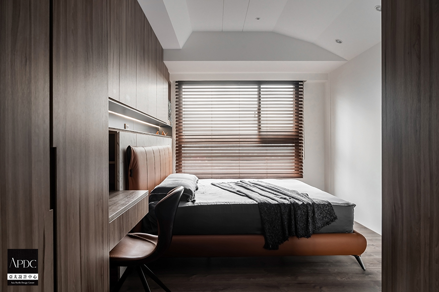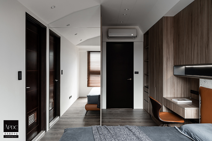 ▲考量主臥格局與順暢動線,將男、女主人的衣櫃分設於入口左右,加以鏡面修飾轉角,放大空間感之餘,也作為穿衣全身鏡;床鋪面對的天花板,以斜面包裹橫梁轉角,並安裝嵌燈補足照明。