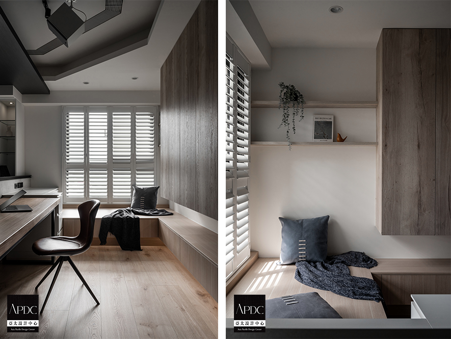 ▲配合業主對視聽設備的要求,客廳電視牆前打造方便安置機體的落地平台,並於一旁加裝純白收納櫃,緩解暗色基底的沉重感;對面的開放式書房,窗邊臥榻一路延伸至背牆的懸空書櫃下,跳脫傳統櫃體造型,使畫面更具延續感。
