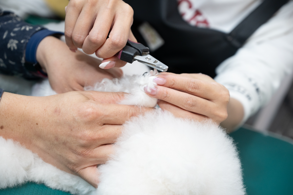 ▲ 邱琦雯在老師指導下幫狗剪指甲。(圖:艾迪昇傳播)