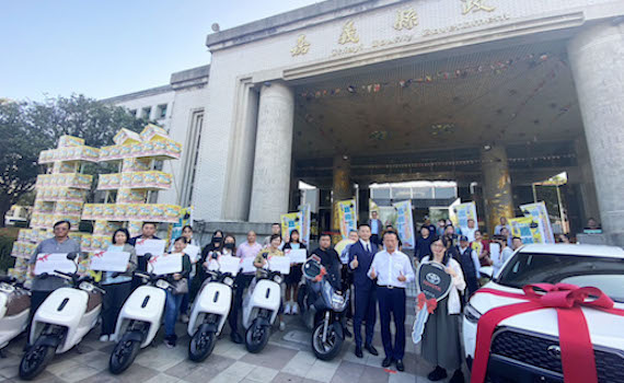 現場也有貳獎gogoro電動機車11台、按摩椅、縣府太子商圈祥元茗茶有限公司加碼提供10萬元的特等茶餅以及縣長加碼禮PGO重機一台的幸運得主皆齊聚一堂,在現場與大家共同分享喜悅,各商圈的代表也來到領獎記者會一同祝賀。