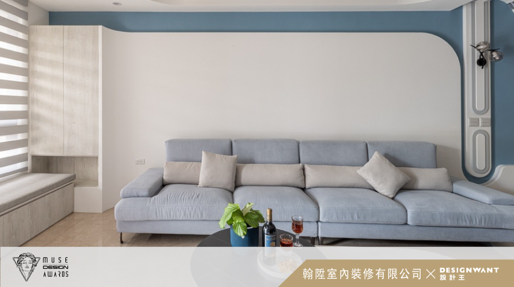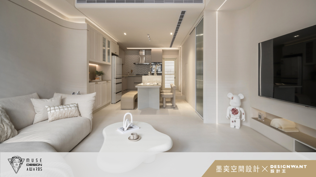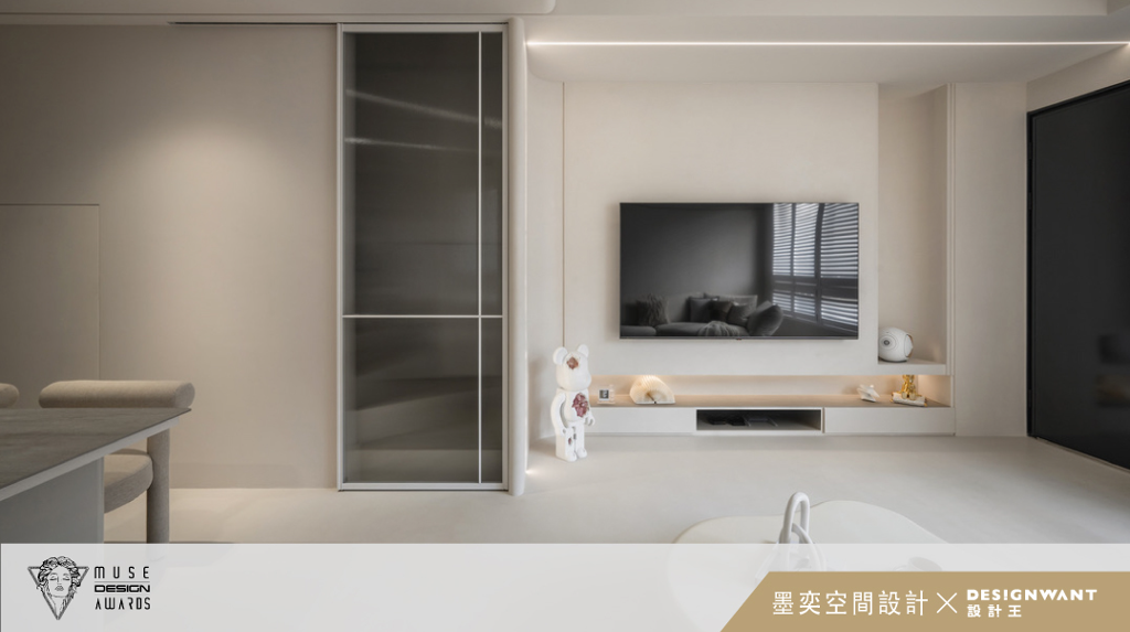 作品以大面積舒適的自然色塊鋪陳,並在細節處安排許多巧思,例如在圓弧的轉折處安排燈帶,賦予空間更豐富的層次、電視牆選用大理石材,凸顯出環境的輕奢華氣度。