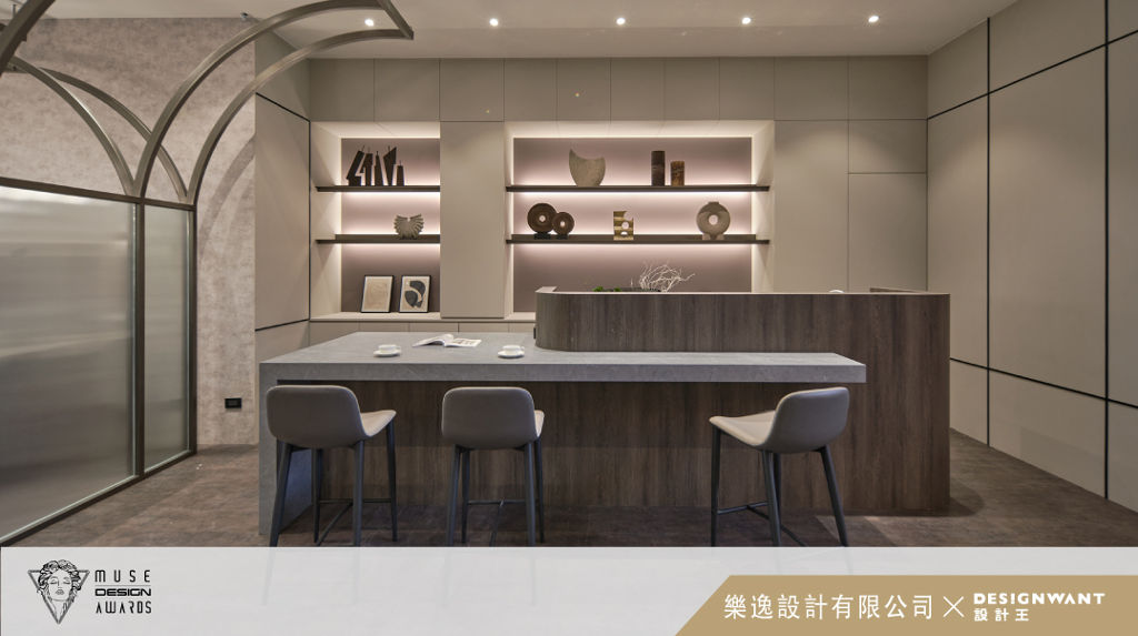 基地為接待中心,本作品取名為「悠然舞徑」,源自於空間從內而外保持一慣性的圓弧設計,設計端剖析基地與建案的條件後,挹注圓弧為設計重點元素,在米灰色的環境中,弧形的律動也成為一片大面積的仿波浪設計,使視覺能一眼被其吸引,室內一樓擁有挑高六米的獨特環境,模型展示區位於空間正中央,燈帶以各種圓弧線條構成,當燈光的灑落時,可以透出虛實變幻的大型光球,非常吸睛。
