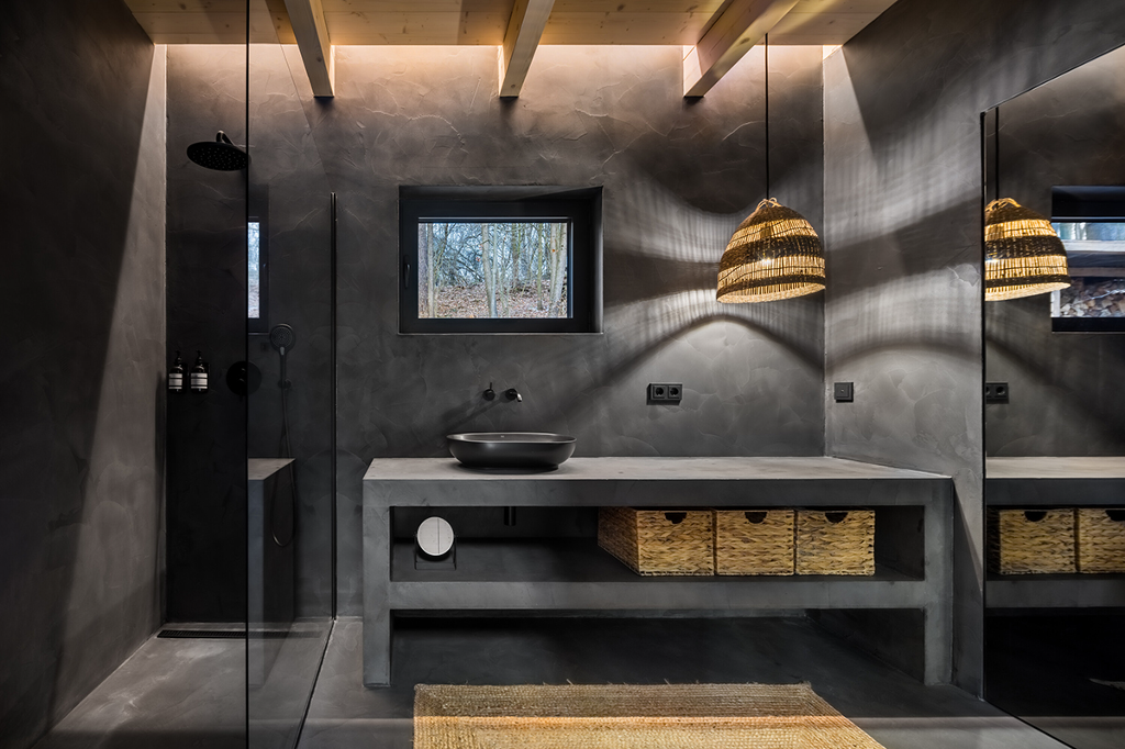 設計師Adam Hofman特意挑高山牆屋頂,提供寬敞的創意空間。在顏色配置上也如出一轍的單純。走入浴室,牆面和地板覆蓋溫和的黑色砂漿醒目又讓人感到親密自在。