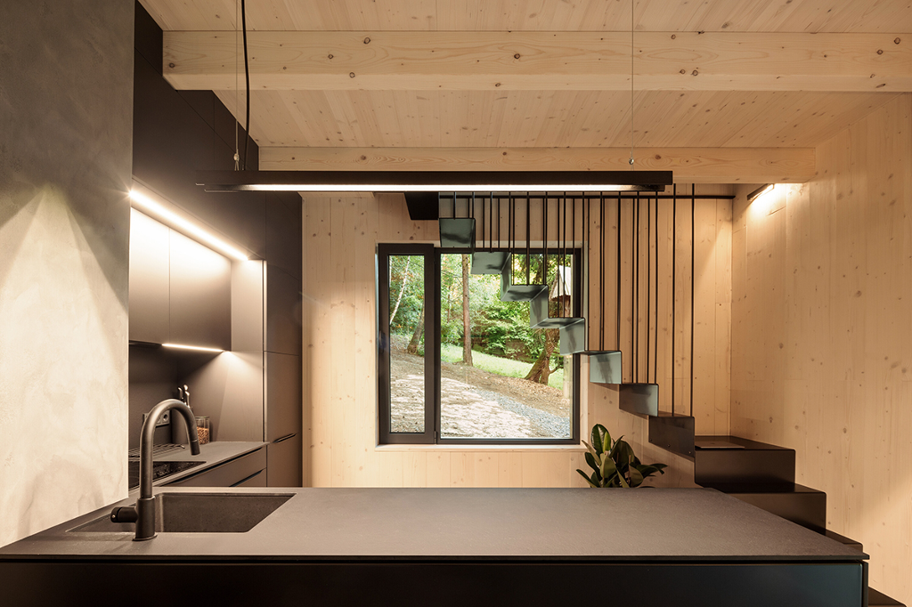 開放式廚房裡精緻輕薄的黑鋼板樓梯由纜繩懸掛,一階階升上位於二樓的主臥室,增添輕盈優雅的氣息。
