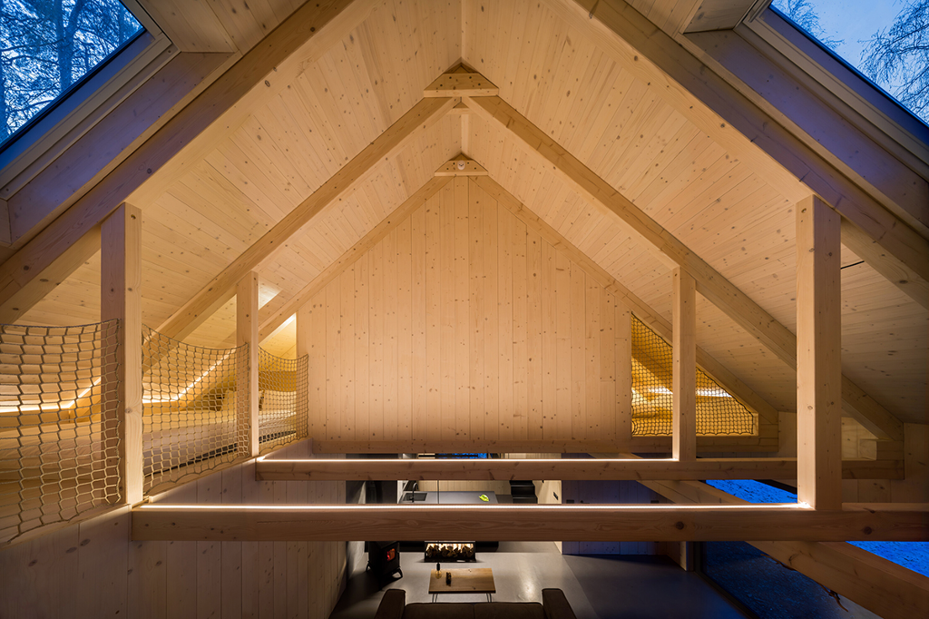 主臥室面朝東方,採用大片落地窗使晨光透入房間,能讓人坐臥在床上欣賞大自然甦醒,提供更加接近自然的生活場域。臥室還連通幽靜的祕密角落。另一個角落位則位於起居區上方的小閣樓,藉由長梯出入。這兩個小角落提供額外的睡眠空間,使Hytta能夠舒適地容納多達六人。