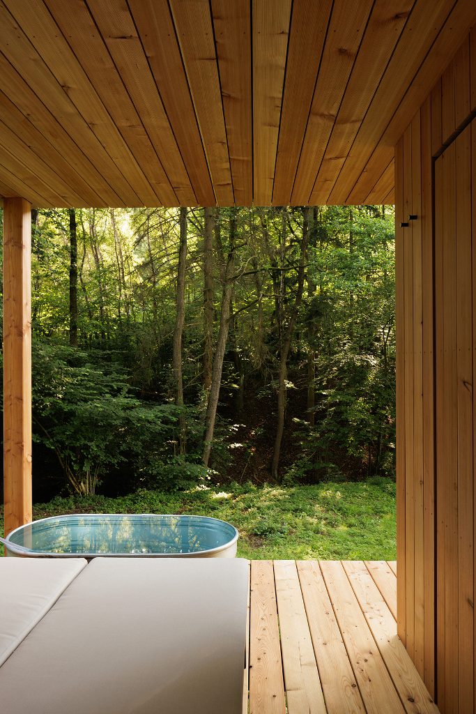 高品質的放鬆也是無擾創造力重要的一部分。這就是為什麼在離Hytta幾公尺遠的地方,會找到設有冷浸浴缸的現代芬蘭桑拿浴室。桑拿房位於略微傾斜的地勢上,一邊享受桑拿浴時,可以一覽無遺地欣賞大自然的美景。6.3坪的大小包含放鬆區、淋浴間和芬蘭桑拿浴室。如同小屋Hytta一樣,它體現了斯堪的納維亞極簡主義的精神,深烤木板色的外牆,幾乎融入了周圍的大自然。整體結構以接地螺絲錨固,通往設施設有輕薄的鋼坡通道,帶來一絲愉快輕盈的氛圍。