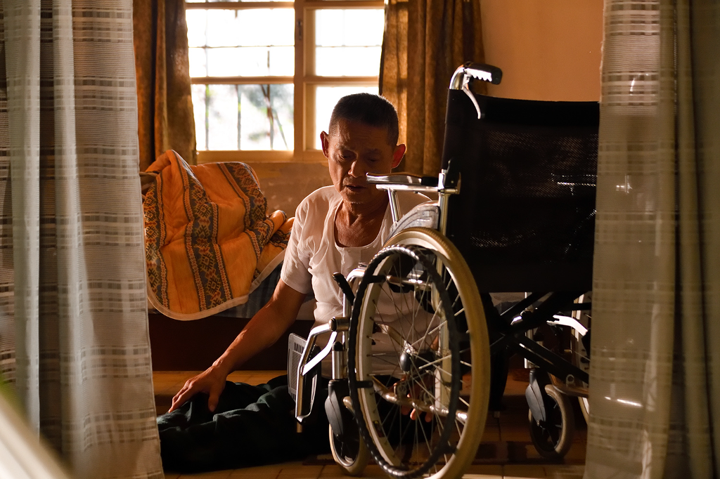 ▲ 鄭平君今年7月不慎出車禍,拍攝期間竟又在飯店房間摸黑摔傷雙膝,不良於行的狀態就是角色所需。(圖:琺珏文創)