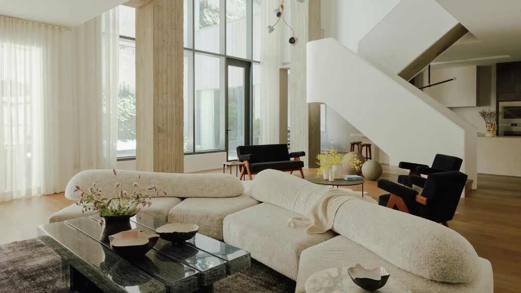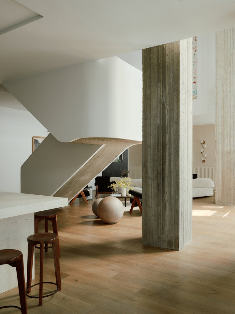 Joo以親子友善為中心,同時保持簡約、寧靜和中性色調。為符合屋主吃素的理念,不使用皮革或動物產品。混合具有光澤和柔軟度的材料。透過流動元素,如通往遊戲室和琴房「融化」的旋轉門,添加超現實的趣味感。並在視覺上融合羊毛和天鵝絨色調,讓挑高的空間有了更多溫度和由Kamp Studios製作的石膏壁爐、BDDW的拼圖畫和古董意大利燈具形成相襯。