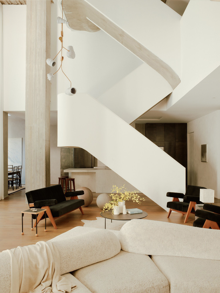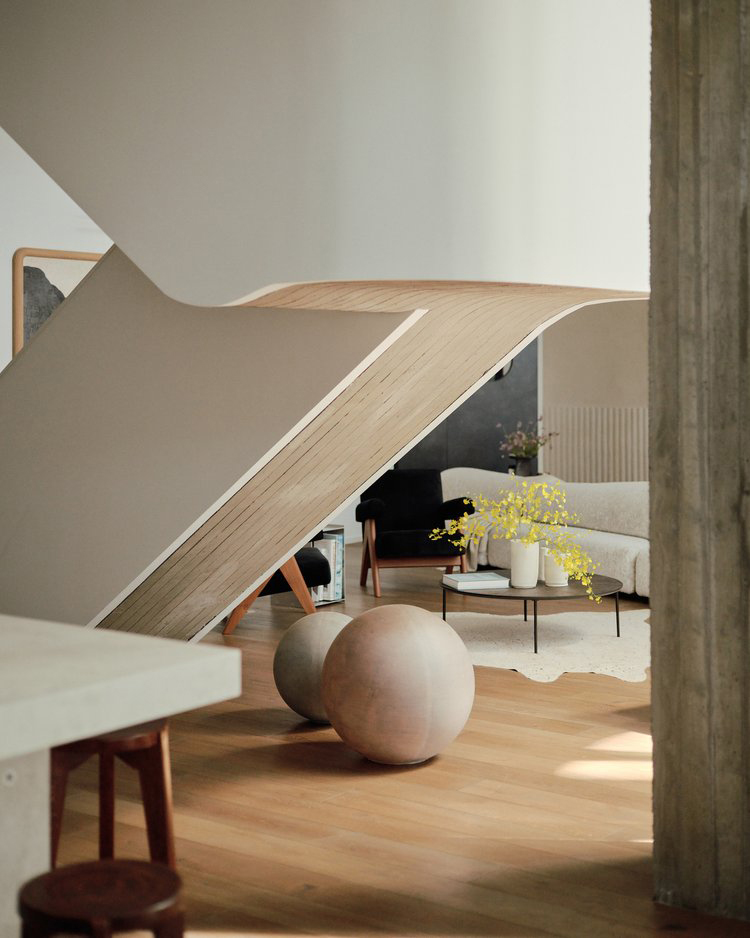 購自DDC的Edra's On the Rocks沙發與雕塑般的樓梯相映。Ruemmler的布燈下,旁邊擺放Timothy Oulton的咖啡桌,無論對人還是對貓都是一個放鬆恬淡的地方,也是這對夫妻在家中最喜歡的家具之一。