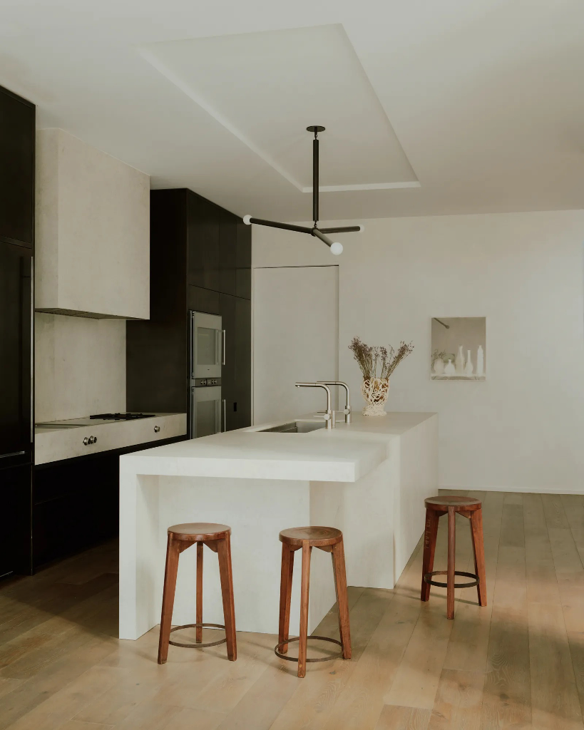 設計師在廚房使用作舊的金屬材質和家電。擴增儲藏室、吧台以及閃閃發光的Gaggneau過濾水。將Apparatus的吊燈懸掛在Dekton中島上,附上P! Galerie的Pierre Jeanneret凳子,呈現極簡張力。