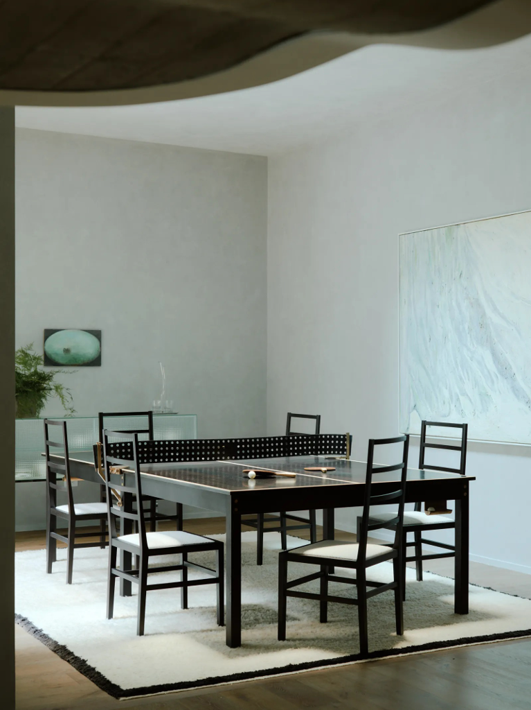 BDDW的乒乓球桌椅絕對會成為客人來訪的亮點。多功能餐桌位立於訂製的地毯上,旁邊掛著Roy Lerner的畫。Joo笑說她想不出有誰比屋主更適合擁有這張桌子,因為她知道他們真的會使用它。