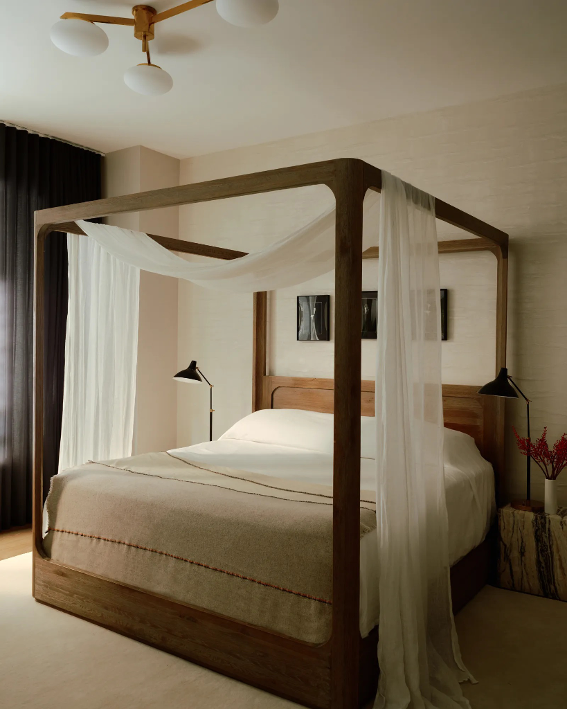 主臥室的床上鋪著Toogood和Teixidors的毯子。床頭混合羊毛、橡木、有紋理的灰泥為房間帶來中性、柔和和寧靜的氛圍,宛如繁忙城市中的綠洲。