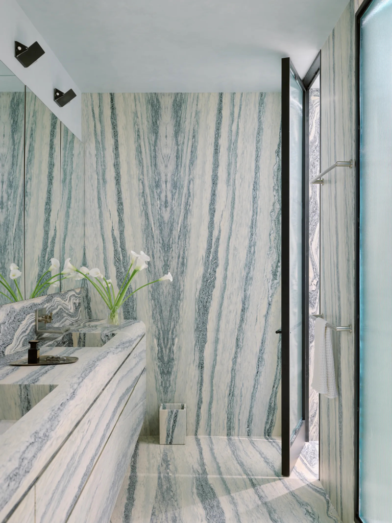 洗手間特別訂製的藍石水槽、Task Gallery的T.D. Sidell燭台和特殊紋理牆面是由設計師精心疊合藍石和混凝土製成,伸手觸摸便能感覺到來自大地深層的紋理訴說於手心之間。