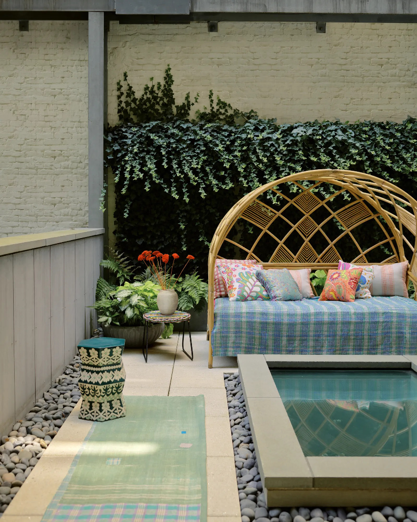 屋主女兒的臥室陽台配有一張竹編臥榻,鋪著來自Etsy的古土耳其古董毯子,Svenskt Tenn和Etro的抱枕,以及一張Marni的邊桌。