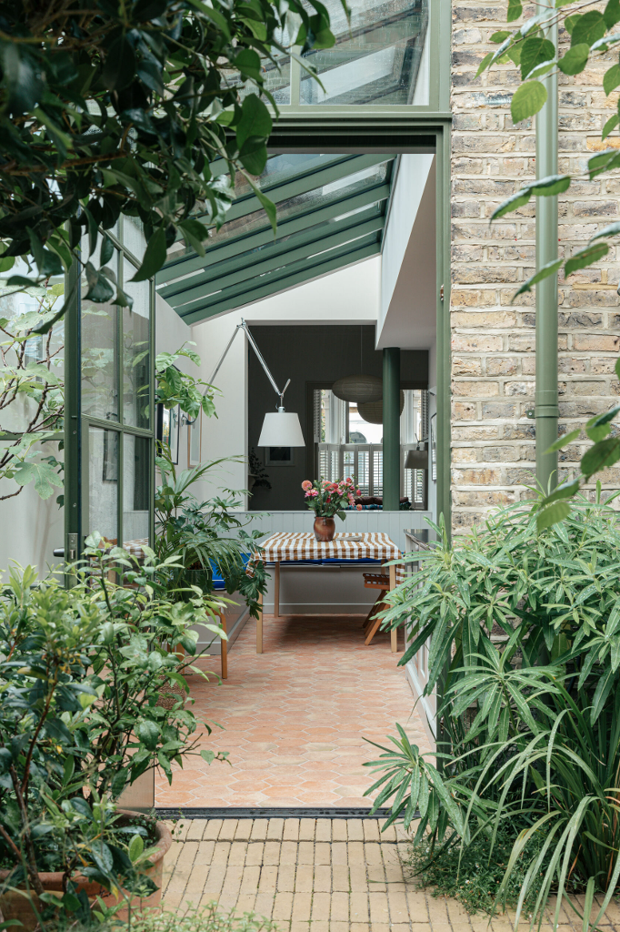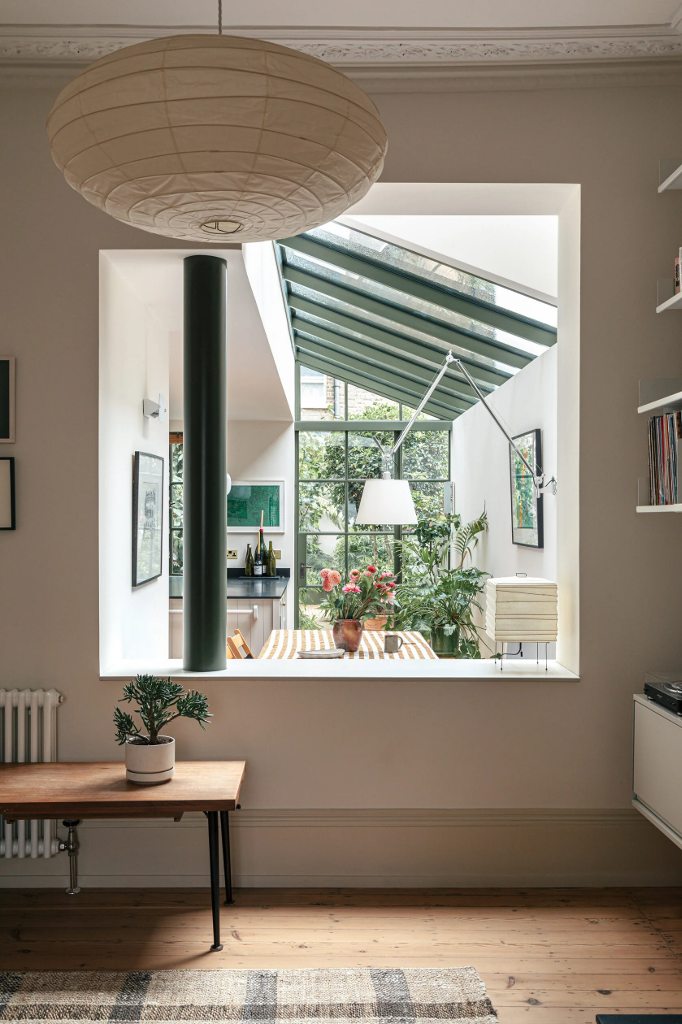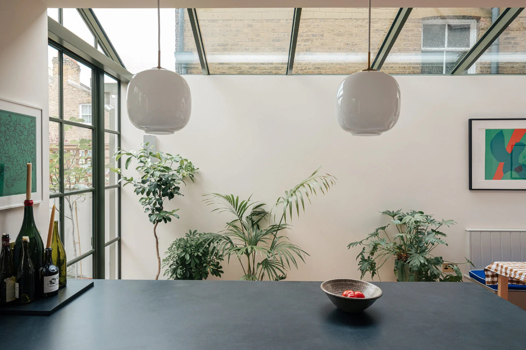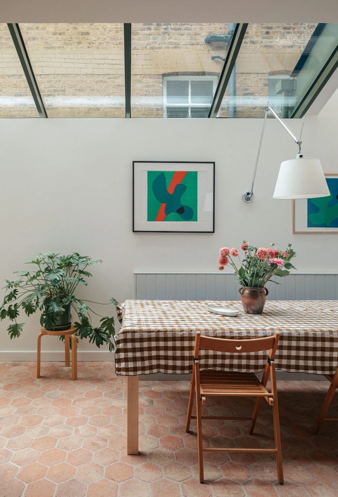設計師Fraher&Findlay在擴建空間時大量使用玻璃拼接天窗和前門,從遠處看,整棟房子宛若一棟玻璃屋。在陽光照耀之下日光均勻散布於位在原建築和擴建部分之間的用餐室。地面的六角紅磚鋪敘出悠閒氣息,牆上掛有與整體色調相襯的飛鳥畫,木質餐桌上繽紛的格紋桌巾配上庭院摺疊木椅,簡單的細節使整個空間綠意盎然外更透著一絲慵懶和諧的氛圍 。當夜晚來臨,點亮曲折造型的壁燈便和星光點點的夜空呼應,構成浪漫晚餐的生活圖像。