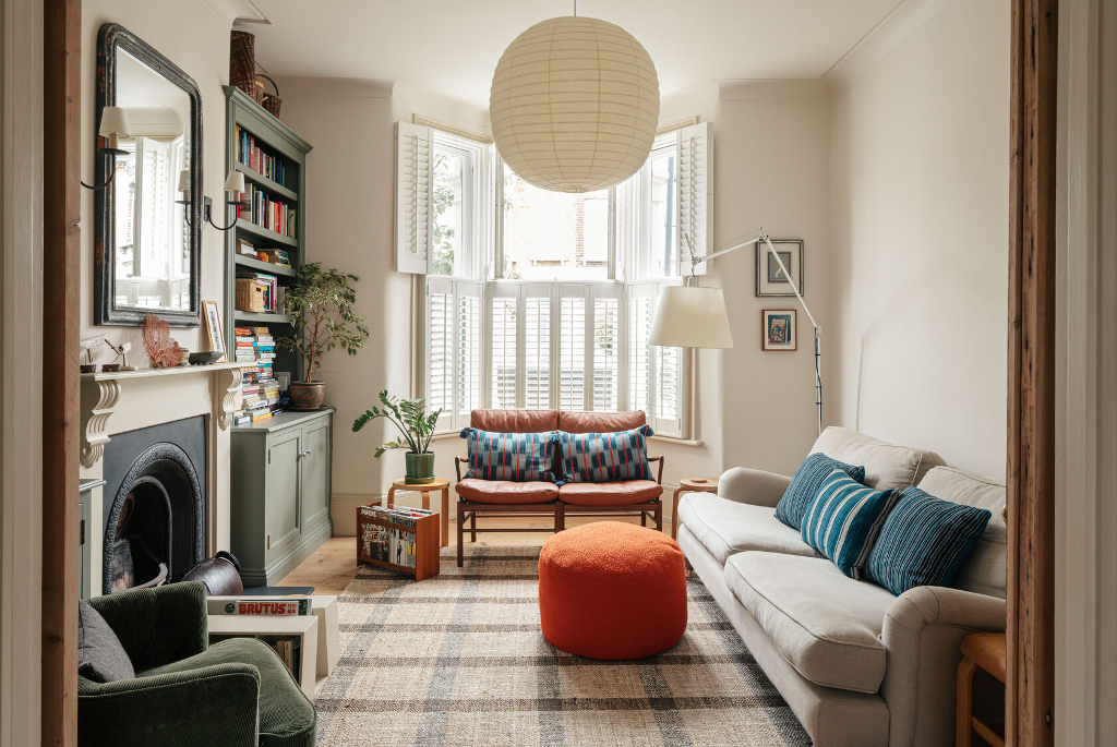 客廳使用百葉窗引入大量自然採光,綠色書櫃、燈芯絨沙發布椅及植栽提供空間放鬆、沉靜的氛圍,藍橘色布織品的對比則為柔和的環境中注入鮮明的活力映像。
