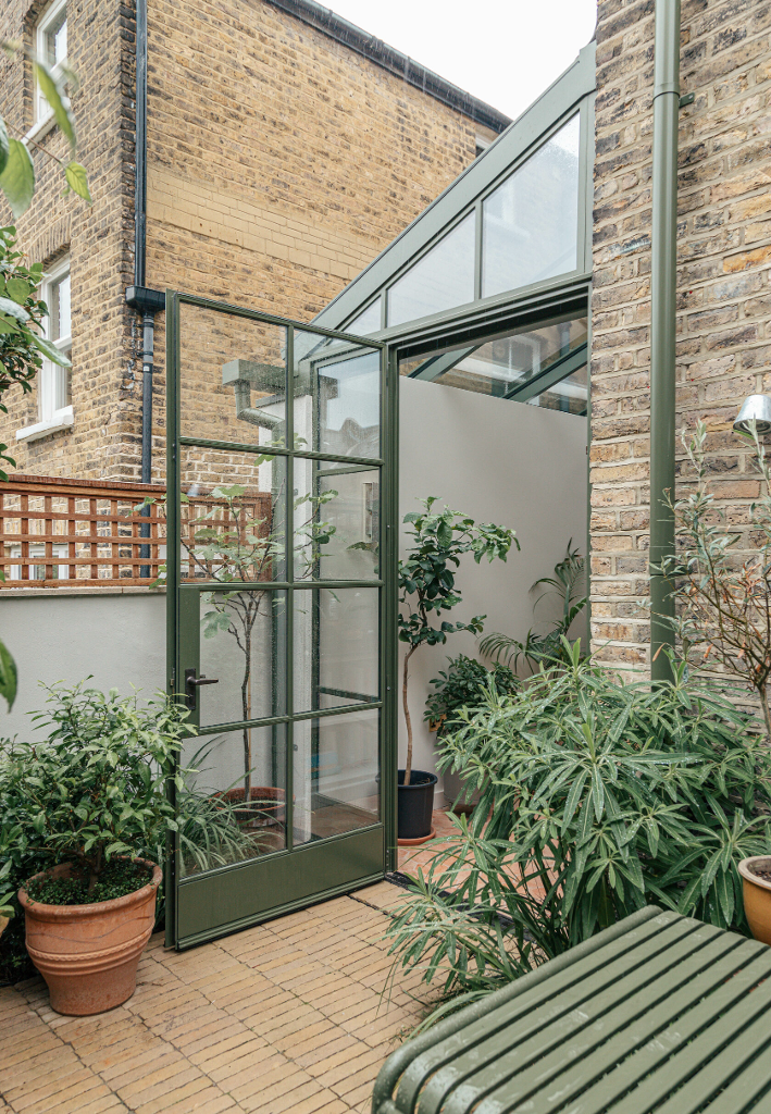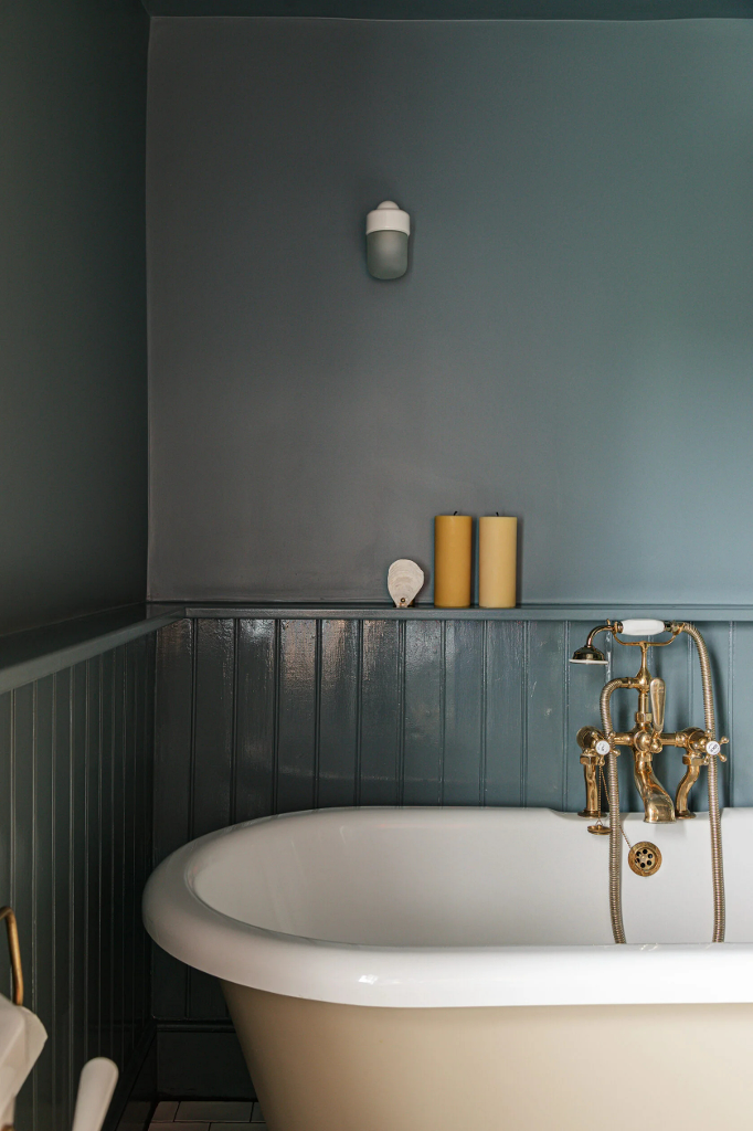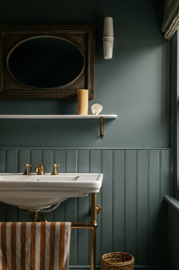 衛浴保留傳統的經典樣式,燙金和典雅的莫蘭迪蘭綠色的復古風格使人好似回到樸實的維多利亞年代。橄欖綠的玻璃框巧妙地延伸到前窗、花園植物、花園家具、甚至應用在排水管上。