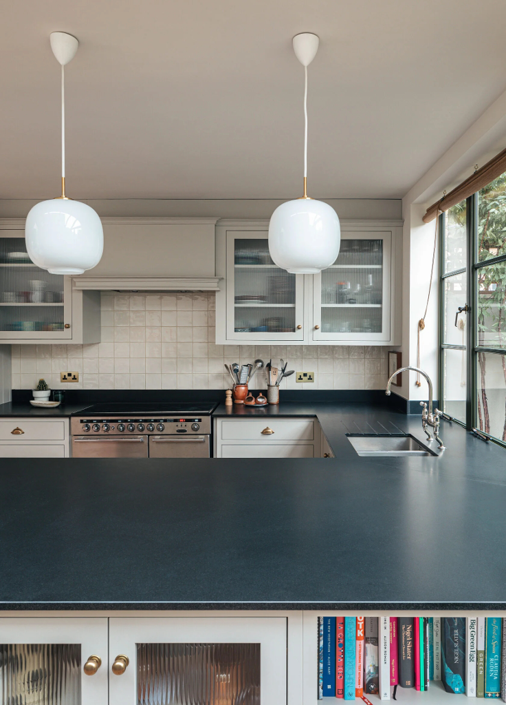 廚房地板磁磚使用和用餐室相同的材質、花色,白色櫥櫃和磁磚延展視覺,開放式空間也營造廚房和玻璃屋的一致性。白瓷般的圓潤燈飾和黑色流理台相呼應,以不同質感延續與其他場域同脈絡的燈籠造型。